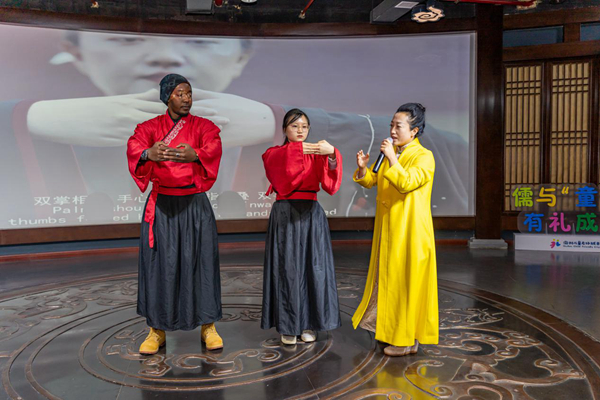 在风颂剧场,留学生们观看了南孔文化中英文研学课程视频,学习了作揖礼。