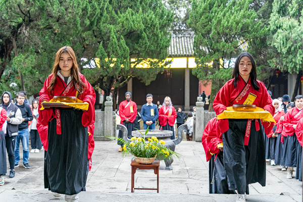 在随后的南宗祭孔体验中,留学生们先是端庄排列在大成殿前,伴随着钟声的敲响,祭司致辞,开始遵从先人的礼序,向大成殿内敬献五谷、洗手、燃烛、晋香,并向殿中的孔子像三鞠躬。完整体验了祭孔典礼礼启、献礼、颂礼、礼成四大篇章。