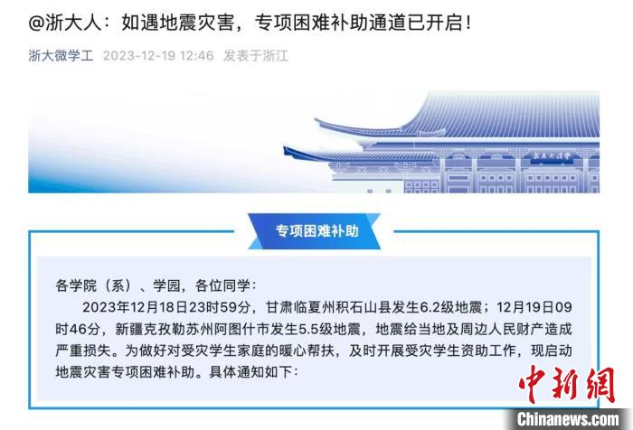 如浙江大学发布消息称,针对近日受甘肃、新疆等地地震灾害影响而导致家庭经济出现困难的本科生,该校及时开展受灾学生资助工作,启动地震灾害专项困难补助。符合条件的学生可提交申请,浙江大学将根据受灾程度核定资助金额,审批通过后发放相关补助。