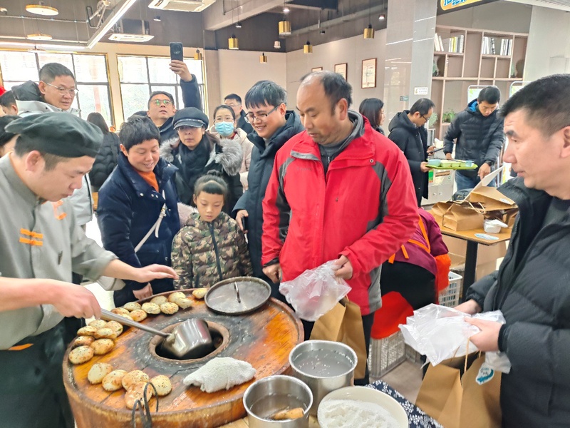随着炉子开火,一阵烤饼香飘散开来,引得人食指大动。香喷喷的梅干菜肉饼一出炉就被抢光,金黄酥脆的饼皮下是饱满鲜美的猪肉馅,佐以清新的小葱和浓郁的梅干菜,让人大饱口福。