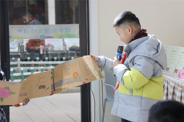 活动现场,蒋风儿童文学院的谢凯泽同学为大家展示了自己创作并绘制的诗集《遥望》,朗诵了其中的《夜,画了一幅画》。另一位蒋风儿童文学院的施胤祥同学则为大家朗读了自己刚刚即兴创作的诗《腊梅》。