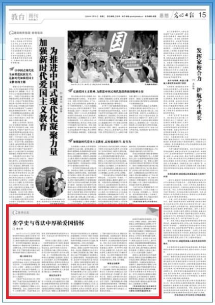 2023年11月21日,《光明日报》教育周刊刊发《让爱我中华的种子牢牢扎根在学生心里》《探索新时代爱国主义教育实践路径》《从爱国情到报国行 青年须经实践淬炼》三篇文章,以深刻的认识、缜密的分析,探索爱国主义课程实践,引导学生厚植爱国主义情怀,引发了笔者在教学实践中如何更好地进行爱国主义教育的思考。