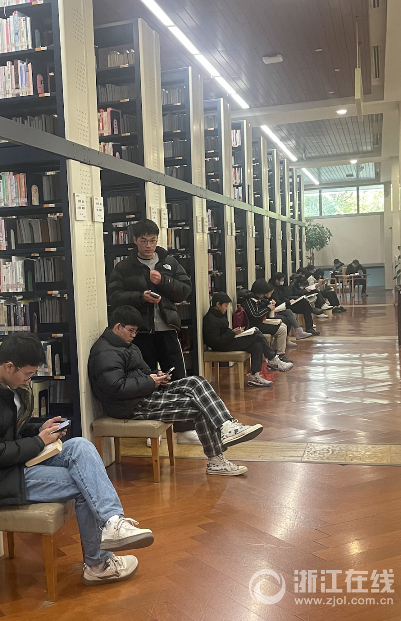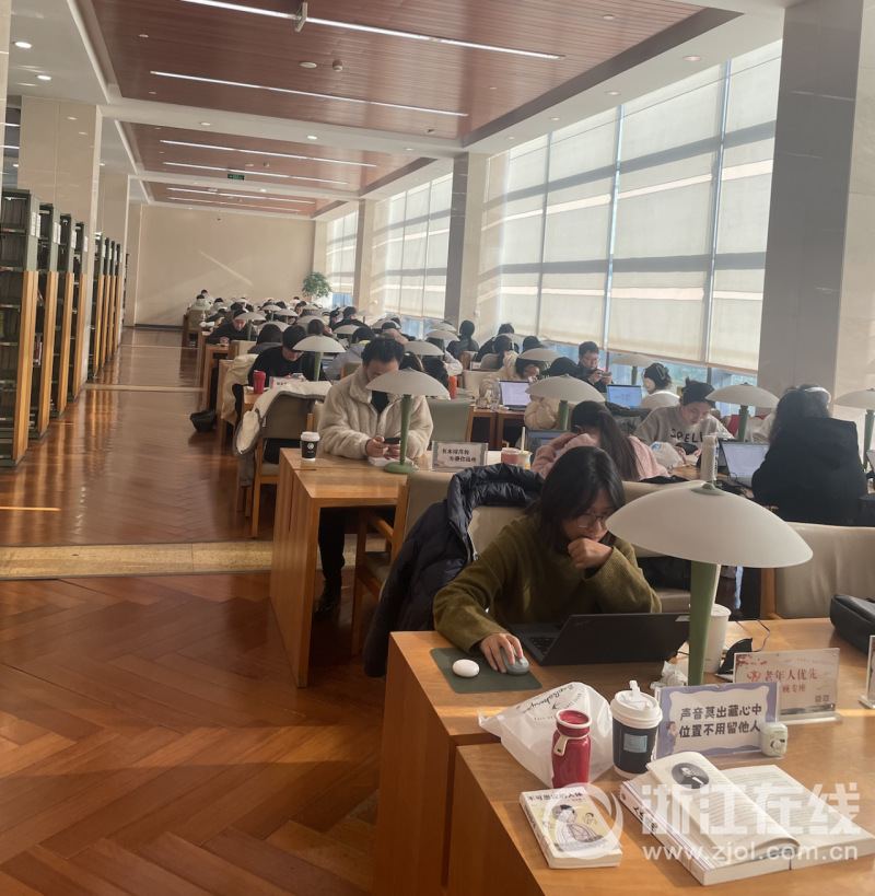 浙江在线1月28日讯(见习记者 高雅)随着大中小学生陆续放寒假,图书馆成了学生们的热门“打卡地”。今天下午,记者来到位于杭州市上城区的“网红图书馆”——杭州市图书馆,发现二楼、三楼的自习区座无虚席,年轻人们在阳光下争分夺秒地奋笔疾书,刷刷的写字声和键盘敲击的声音此起彼伏。