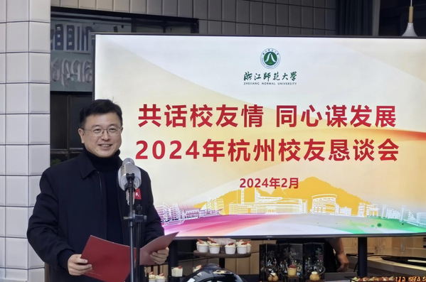 蒋云良代表学校对各位校友相聚杭州表示欢迎,并详细介绍了学校过去一年的发展亮点。蒋云良指出,校友资源是学校最重要的资源,也是学校事业发展最可信赖的支持力量。浙江师范大学始终将校友工作放在学校办学的重要位置,希望各位在杭校友能够一如既往地关心、支持母校,在“高层次人才”引进、“重大平台”打造、“优质资源”汇聚等方面牵线搭桥,为学校加快建成特色鲜明的一流大学贡献更多校友智慧和力量。