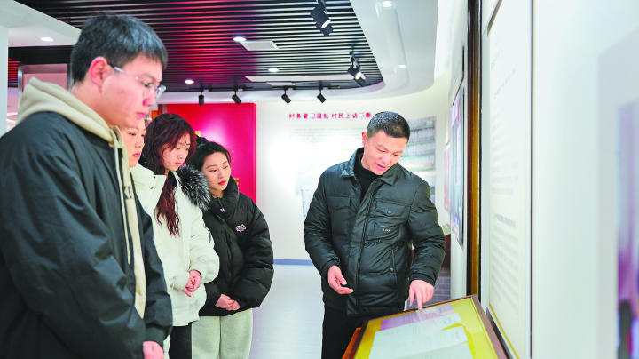 在“后陈经验”展示馆内,后陈村党支部书记陈军(右一)向00后观察员介绍后陈村务监督制度的发展过程。图片来源 潮新闻