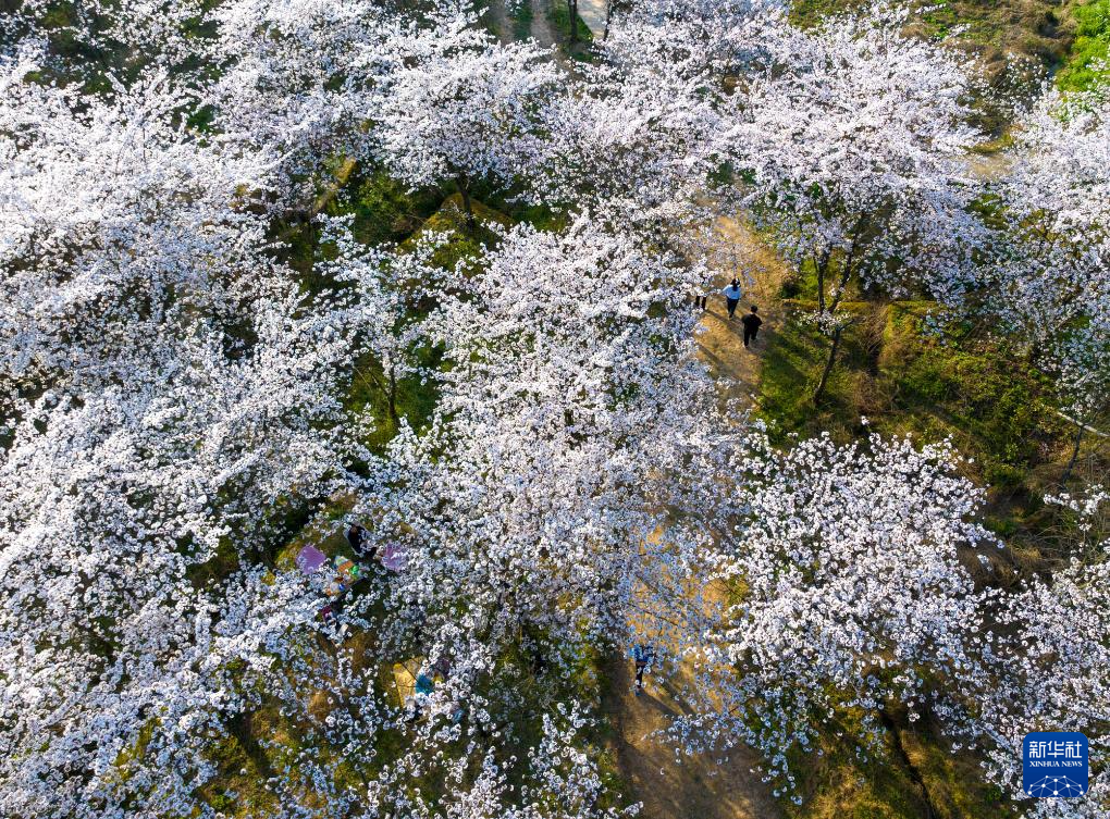 ↑2024年3月21日,游人在重庆市南川区木凉镇玉岩铺村樱花园内赏花踏青。(无人机照片)CICPHOTO/罗川 摄
