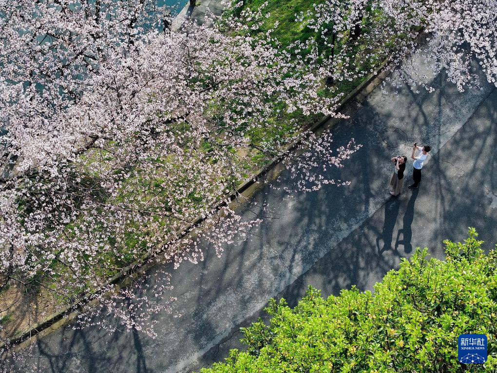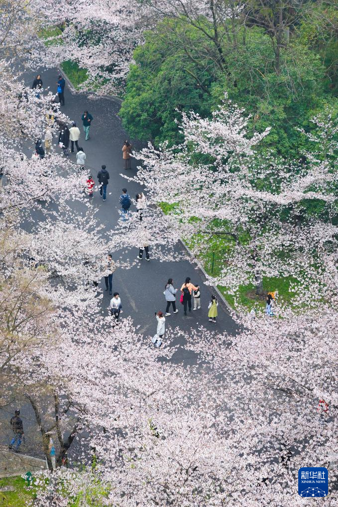 ↑2024年3月24日,游人在江苏南京林业大学内观赏樱花。(无人机照片)CICPHOTO/苏阳 摄