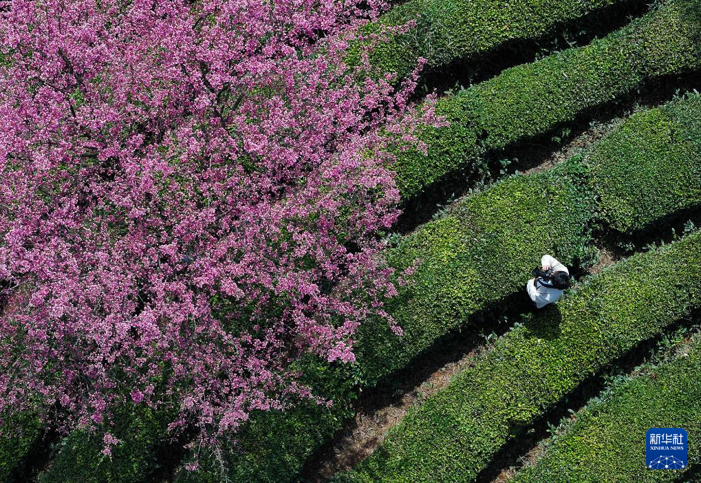 ↑2024年3月19日,游人在安徽省黄山市徽州区谢裕大茶博园内观赏樱花。(无人机照片)CICPHOTO/施亚磊 摄