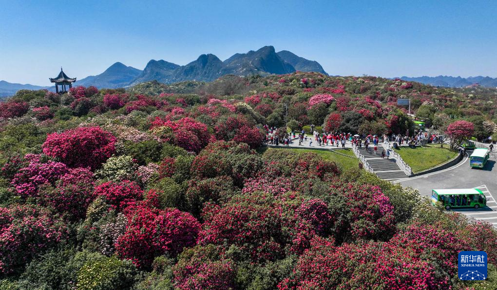 ↑2024年3月24日,游人在贵州省毕节市百里杜鹃管理区普底景区赏花游玩。(无人机照片)0CICPHOTO/韩贤普 摄