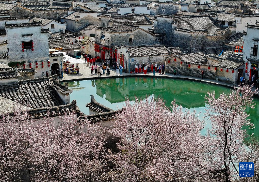↑2024年3月21日,游人在安徽省黄山市黟县宏村赏花踏青。(无人机照片)CICPHOTO/施亚磊 摄