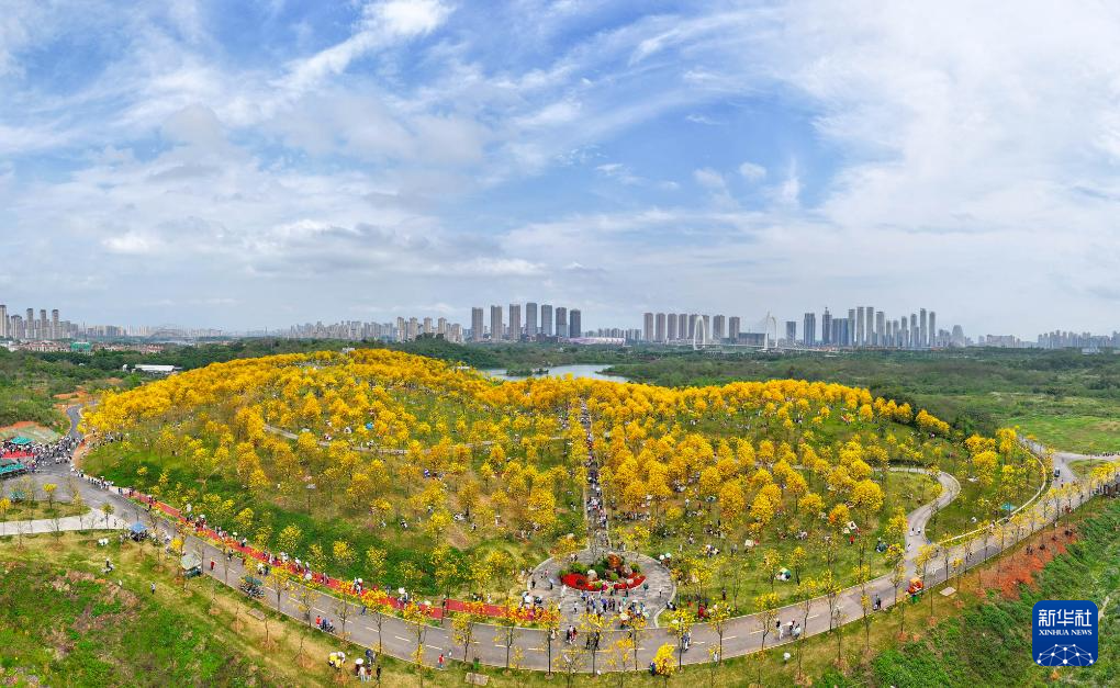 ↑2024年3月23日,游人在广西南宁市青秀山景区风铃谷观赏黄花风铃木。(无人机照片)CICPHOTO/喻湘泉 摄