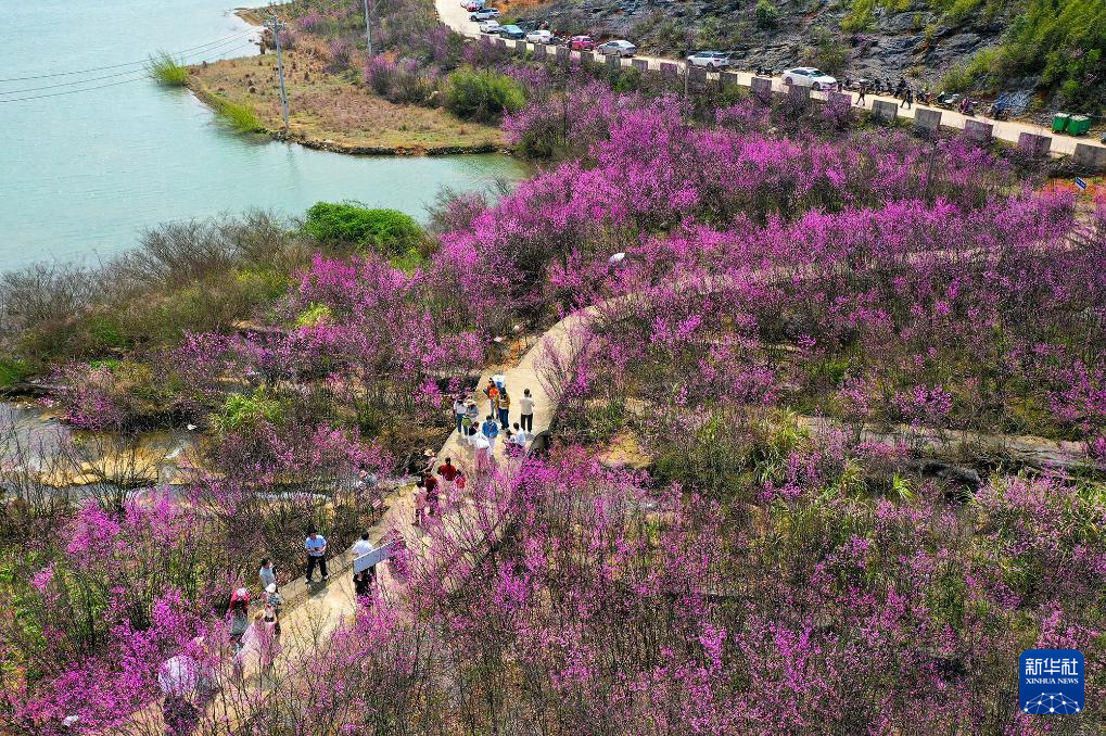 ↑2024年3月24日,游人在湖南省江永县松柏瑶族乡花楼村野生紫荆林里赏花游玩。(无人机照片)CICPHOTO/潘百旺 摄