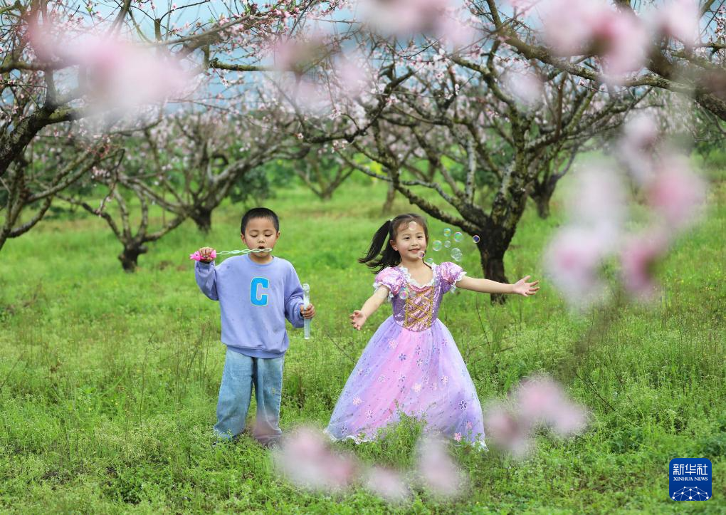 ↑2024年3月23日,小朋友们在湖南省永州市道县大坪铺农场桃园里游玩。CICPHOTO/何红福 摄