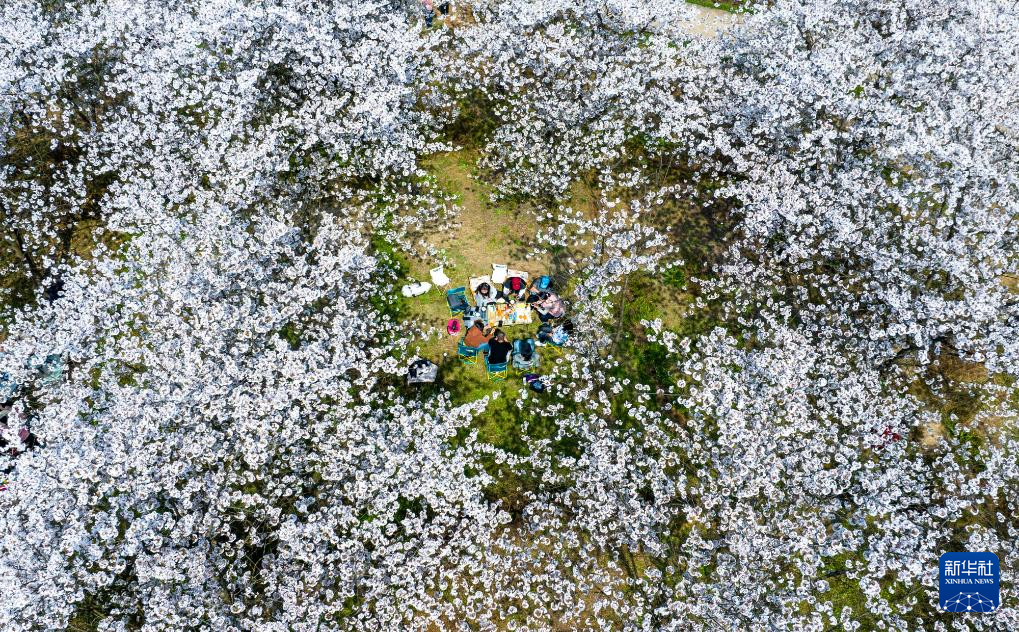↑2024年3月22日,游人在重庆市南川区木凉镇玉岩铺村樱花园内野餐露营。(无人机照片)CICPHOTO/甘昊旻 摄