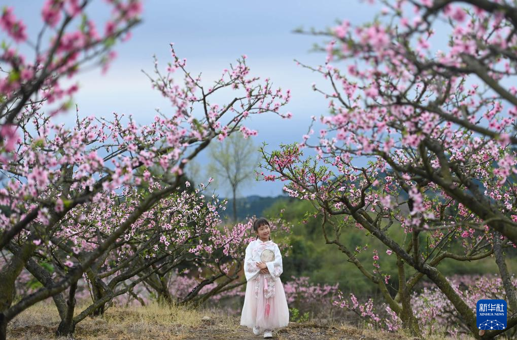 ↑2024年3月24日,四川省南充市蓬安县相如街道油房沟社区,一名小朋友在观赏桃花。CICPHOTO/周亮 摄