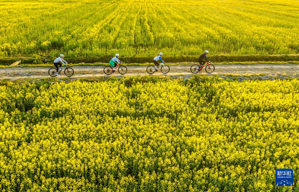 ↑2024年3月22日,安徽省芜湖市繁昌区峨山镇沈弄村,骑行爱好者穿行在油菜花海中。(无人机照片)CICPHOTO/肖本祥 摄