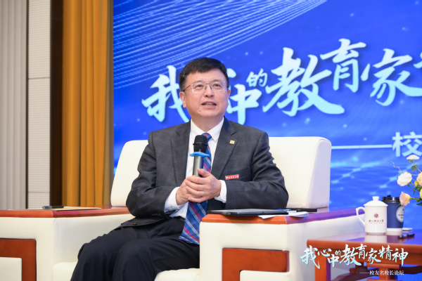 “好雨知时节,校庆乃发生。”邱利民开场借诗,巧引“及时雨”的内涵,对现场嘉宾的到来表示热烈欢迎。论坛主要围绕“对教育家精神的理解”“践行教育家精神的故事”“浙师人如何培养和传承教育家精神”三个话题展开讨论。