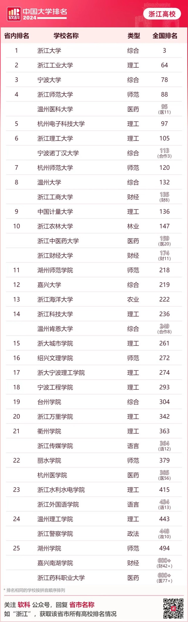 综合性大学、单科性大学和合作办学大学放在一个榜单中,浙江高校情况如何?各所大学省内排名又是什么样?请看下图汇总。