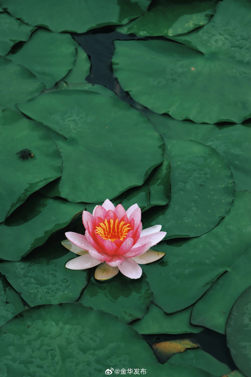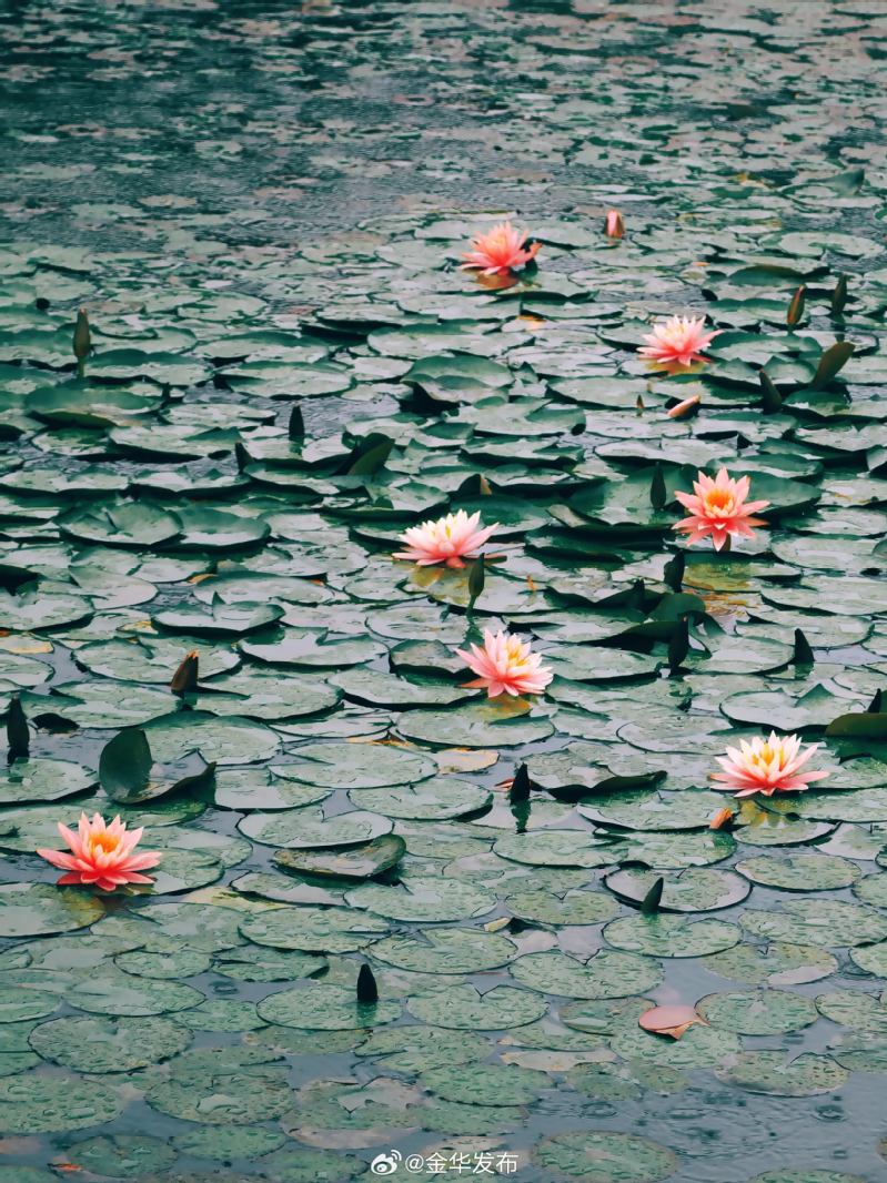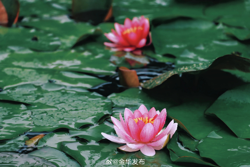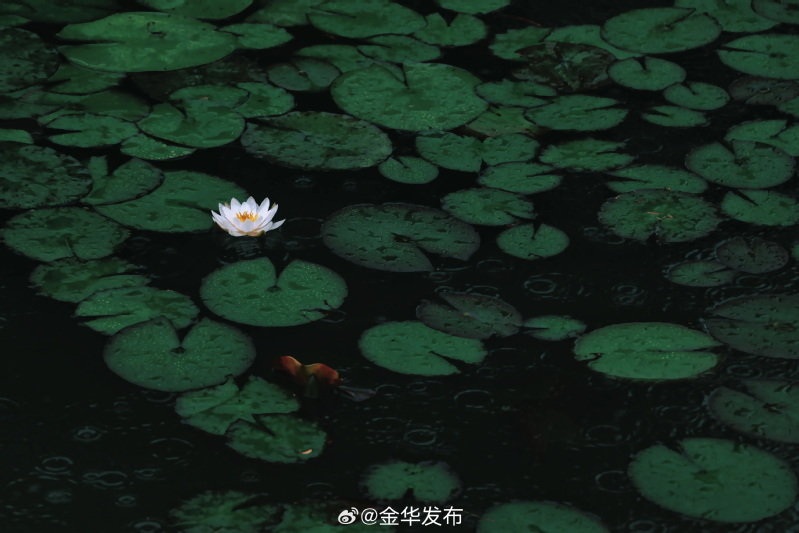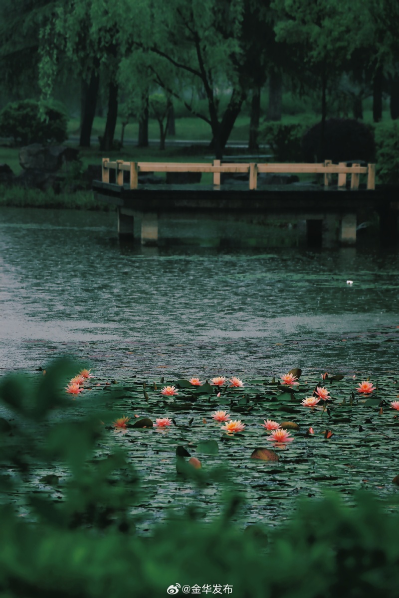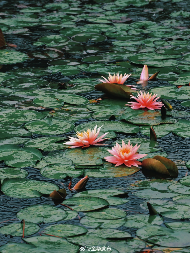 一场雨水,浙江师范大学内的睡莲更显妩媚动人。雨丝滑落,水面泛起阵阵涟漪,怒放的花朵和含蓄的花苞相映成趣,别有韵味。