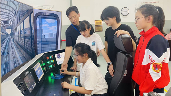 研学第二站:浙师大实验室。在学长学姐们的引领下,同学们在轨道交通省级协同创新中心、智能制造产教融合基地深度体验了轨道交通系统的运行、智能制造系统和机器人场地赛。