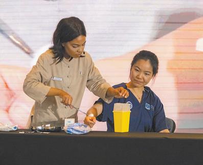在2023年举行的第二十二届“汉语桥”世界大学生中文比赛南非赛区决赛中,来自西开普大学中医孔子学院的学生希诺(左)展示针灸治疗。 本报记者 邹 松摄