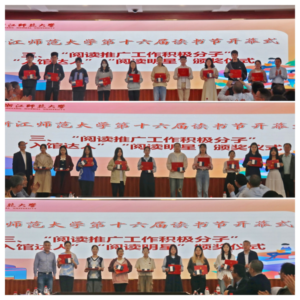 现场表彰了浙江师范大学2023年度“阅读明星”、“入馆达人”和“阅读推广工作积极分子”。校党委委员、宣传部、教师工作部部长葛永海,校党委学生工作部副部长薛俊强,校党委研究生工作部副部长莫世亮,校教务处副处长徐展斌,校团委书记魏梦璐等老师为获奖学生颁发荣誉证书。
