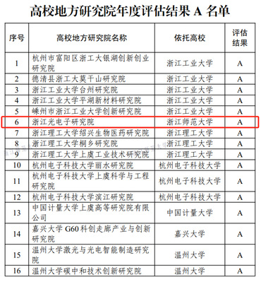 近日,在浙江省教育厅组织的高校地方研究院年度评估中,我校“浙江光电子研究院”获得佳绩,被评定为A等级。全省96家高校地方研究院获评A等级的共16个。
