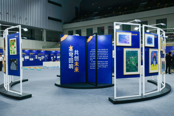 值得注意的是,展览中心圆形区域精心布置了“星穹回响,共创未来”的主题美术作品展。该展览涵盖了浙江省各地区特殊学校孤独症儿童的美术作品,以及浙江师范大学学生为孤独症儿童创作的书画作品。主题美术作品展共有民俗文化、自然环境、生活情感、亚运特辑、关心爱护五个版块。这些作品笔触生动、自然童真,作为心灵沟通的桥梁,帮助展览观众更好地进入孤独症儿童的独特视角和情感世界。