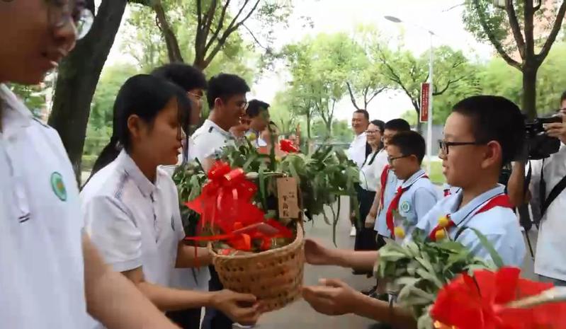 浙江金华。人行道上,一群排着整齐队伍的小学生格外引人注目,他们有的手上提着满满一篮粽子,有的拿着一筐糕点。据悉,这是来自浙师大附小的孩子们,得知对面浙师大附中的哥哥姐姐们马上要高考了,孩子们决定将端午节活动包的粽子送给他们,搭配上“定胜糕”和亲手写的祝福,仪式感拉满,相信有弟弟妹妹的祝福加持,哥哥姐姐们一定能超常发挥,一举高中!