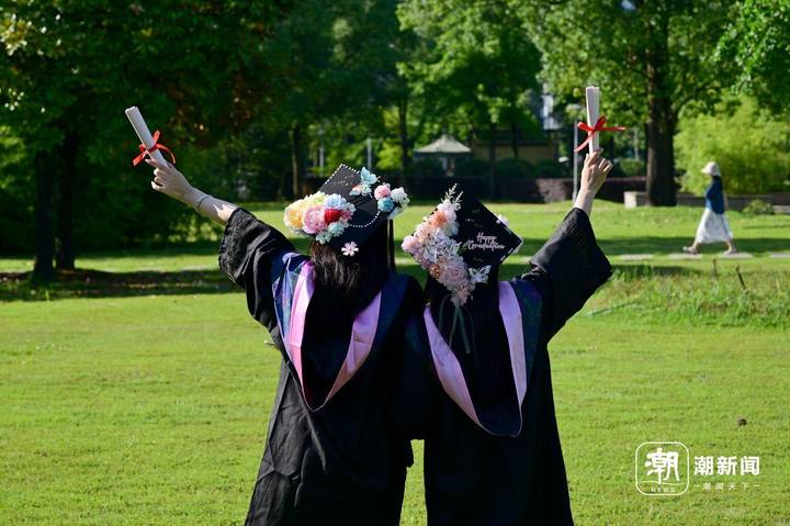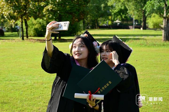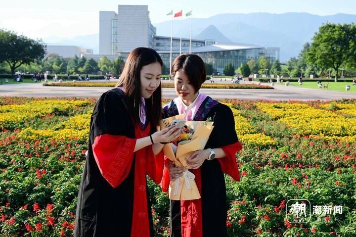 6月13日,位于金华市的浙江师范大学,两位即将毕业离校的博士研究生正身穿学位服在校园里拍摄毕业照致青春。