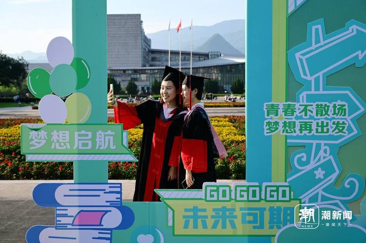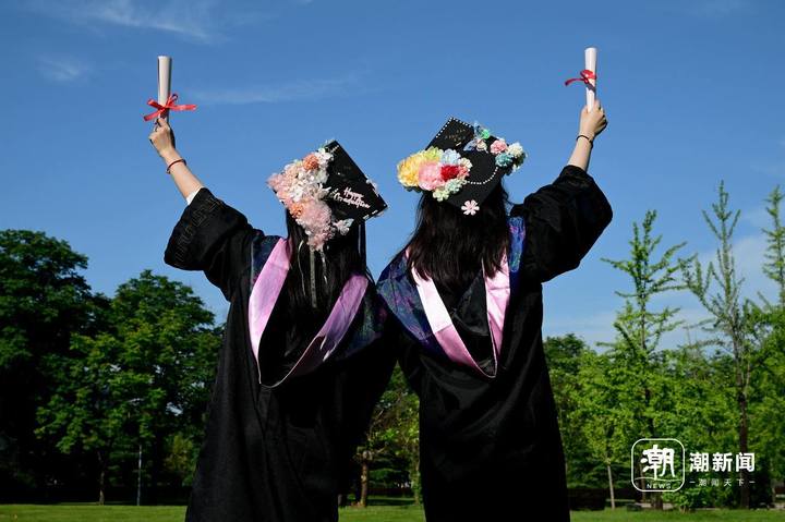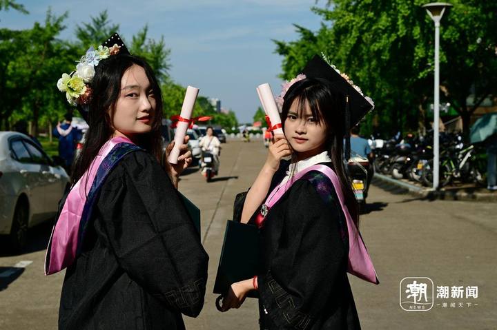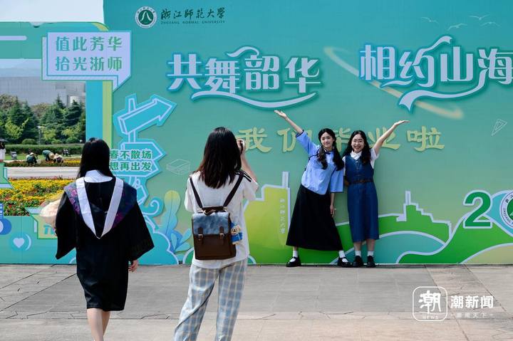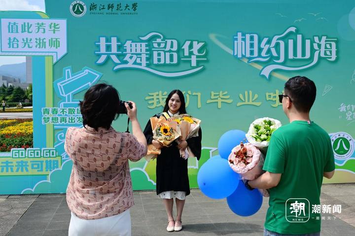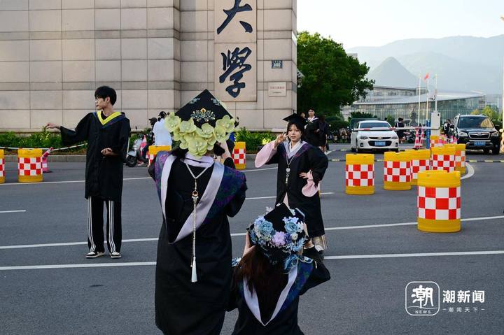 6月13日,位于金华市的浙江师范大学校门口,即将毕业离校的大学生头戴国风簪花帽、身穿中式元素混搭的学位服在拍摄毕业照致青春。