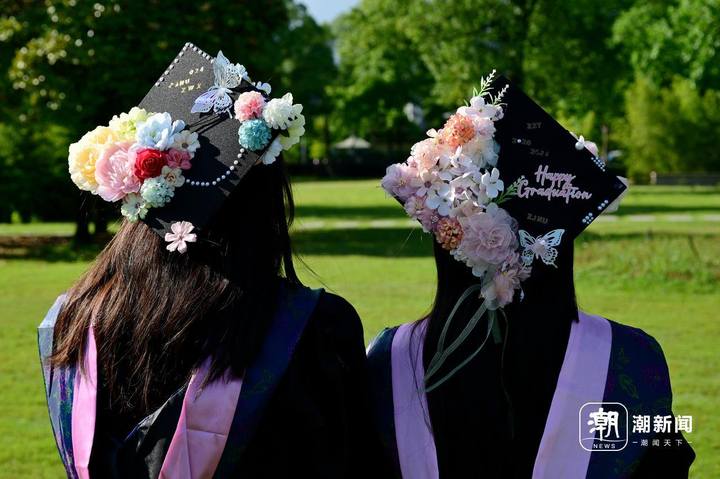 6月13日,位于金华市的浙江师范大学校园里,即将毕业离校的大学生头戴国风簪花帽、身穿中式元素混搭的学位服在拍摄毕业照致青春。