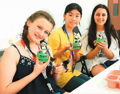 来自英国霍斯福斯学校的塔比(左一)和德尔菲(右一)在浙江师范大学与语伴叶琳一起体验中国传统技艺——面塑。
