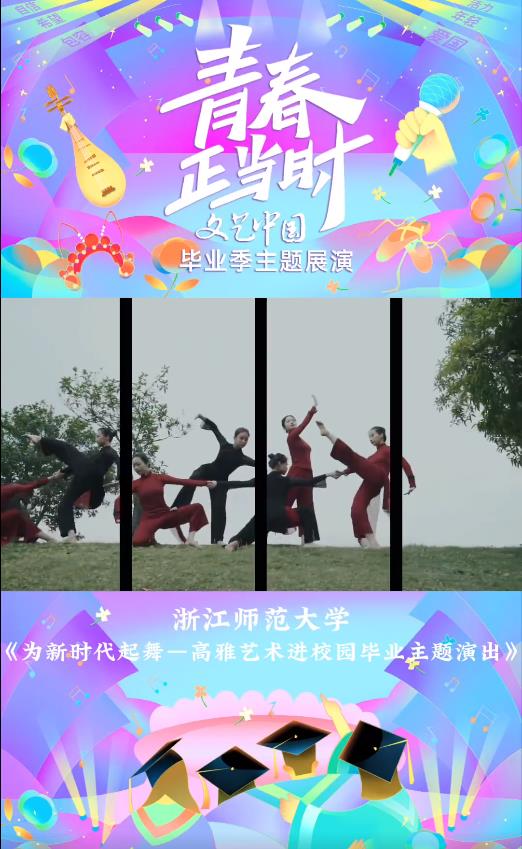 8月3日15:00 “文艺中国”青春正当时毕业季主题展演--浙江师范大学《为新时代起舞—高雅艺术进校园毕业主题演出》!浙江师范大学艺术学院坚持“崇德、精艺、尚美、笃行”,学生多次在国际舞台上展示风采并获奖,为浙江及全国培养了大批艺术教育及管理人才。晚会在序曲《只此青绿》中拉开序幕,融合了现代舞、民族舞等多种形式,体现了艺术学院学子良好的舞蹈素养和学院人才培养的成果。