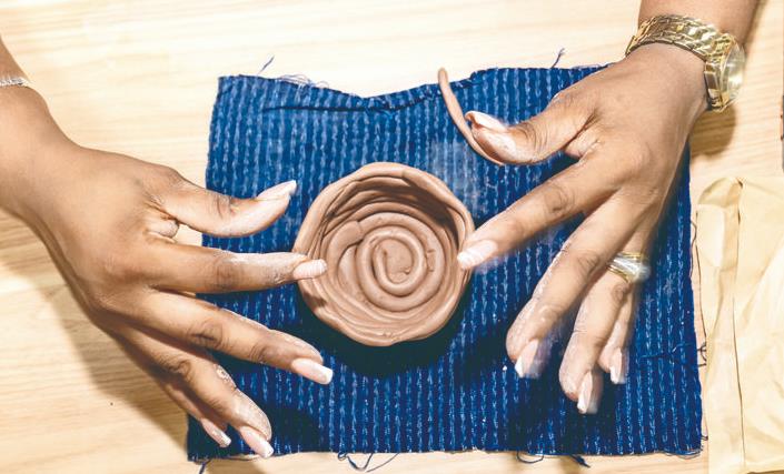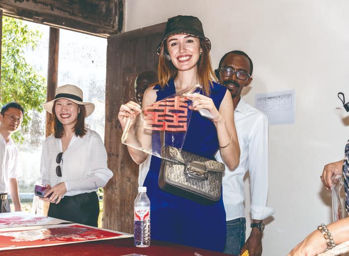 圭亚那总理办公室通信官员Melissa Akeisha在嵩溪村体验窗花技艺
