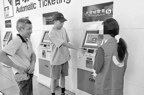 大学生社工赵鑫浩(中)带领菲儿(右一)到高铁站做义工。