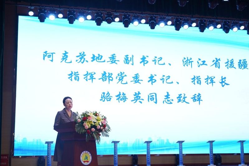 阿克苏地委副书记、省援疆指挥部党委书记、指挥长骆梅英指出,成立南疆语文教研中心对铸牢中华民族共同体意识、推动教育高质量发展、深化“组团式”教育援疆有重要意义,是深入贯彻落实党的二十大、二十届三中全会和第九次全国对口支援新疆工作会议精神的务实举措,她希望各单位能聚焦南疆教育事业需求,整合北京、浙江和南疆等地教育资源优势,深化创新、谋深谋实、先行先试,着力构建高效能机制,着力搭建综合性的协同创新平台,开展战略性、基础性、前瞻性问题研究,着力打造一批语文课题研究、教学能手、学科研修基地、推广国家通用语言文字品牌活动的标志性成果,推动教育援疆从“输血”向“造血”转变,促进南疆语文教学整体提高和均衡化发展。