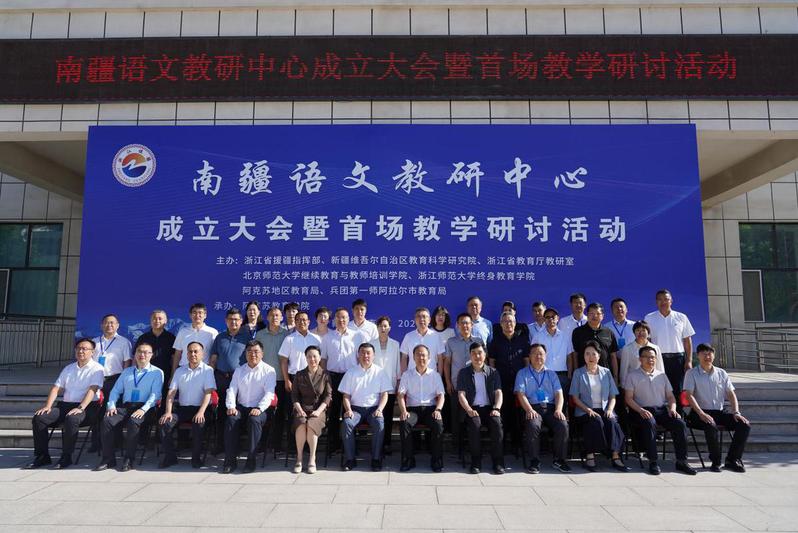 为深入贯彻落实党的二十大、二十届三中全会和第九次全国对口支援新疆工作会议精神,充分发挥教育援疆优势,更好地发挥新疆阿克苏南疆教育示范区作用,辐射带动南疆基础教育一体化高质量发展,8月12日,由浙江省援疆指挥部发起,联合新疆维吾尔自治区教育科学研究院、浙江省教育厅教研室、北京师范大学继续教育与教师培训学院、浙江师范大学终身教育学院、阿克苏地区教育局、兵团第一师阿拉尔市教育局等6家单位共同建设的南疆语文教研中心正式揭牌成立。新疆维吾尔自治区教育厅党组成员、副厅长许高勇,阿克苏地委副书记、省援疆指挥部党委书记、指挥长骆梅英,人民教育出版社副总编辑、编审、中国教育学会中学语文教学专业委员会秘书长朱于国,阿克苏地委委员、地委教育工委副书记包尔汗·买买提出席会议,阿克苏地区行署副专员王新春主持会议。