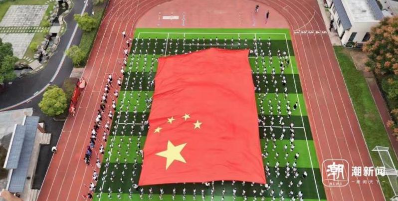 9月29日,在浙师大附属小学,一面巨型五星红旗从操场上方缓缓移动,国旗由该校一千多名师生传递,并现场合唱《歌唱祖国》共同为祖国庆生,随后全体师生一起举行了庄严的升旗仪式,五星红旗冉冉升起,迎风飘扬。
