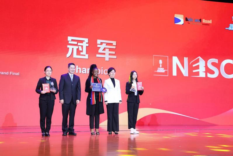 曲莹璞(左二)、徐缨(右二)为获得第六届“一带一路”青少年英语演讲比赛全球总决赛暨第二十九届“21世纪杯”全国英语演讲比赛总决赛(大学组和青年组)冠军颁奖。中国日报记者王敬 摄