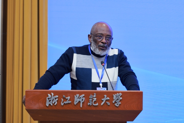 南非数学科学与应用研究所联席主任、国际数学联盟原副主席、南非金山大学原校长Loyiso G. Nongxa讲话。浙师大融媒体中心 郁迦元 摄