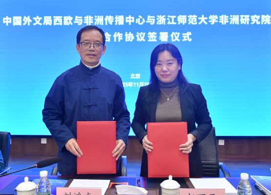 11月25日,为更好地学习贯彻“十五五”规划精神,推动相关领域研究与合作,中国外文局西欧与非洲传播中心(以下简称“欧非中心”)与浙江师范大学非洲研究院(以下简称“浙师大非洲研究院”)签署战略合作协议,并联合教育部非洲研究院在北京共同举办“中非携手推进现代化”研讨会。欧非中心主任赵丽君,浙师大非洲研究院院长刘鸿武出席会议并讲话。