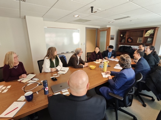 在天普大学,吕迎春一行同教育与人类发展学院院长莫妮卡·雪莱、研究生院院长雷内·托宾、人文学院副院长西拉姆·艾尔达隆多、国际学生项目主任莉亚·哈泽尔等进行会谈。双方对过去十五年来的合作成效给予了充分肯定,并表示将进一步深化学生双向交流,推进中文教学合作,拓展法学、心理学、特殊教育等学科领域的合作空间,并就下一年度重点推进的合作项目、合作领域达成共识。访问期间,吕迎春一行还考察了天普大学中文教学中心,了解汉语教学和文化活动开展情况。