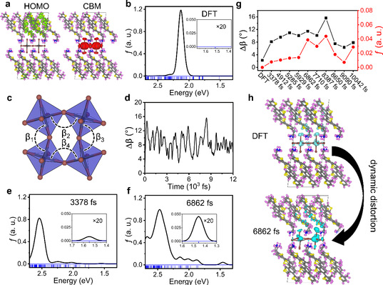 浙江大学课题组采用时间分辨的光谱技术对(BTm)2PbI4体系的研究发现,除了[PbI4]2-和BTm+产生的吸收峰之外,在(BTm)2PbI4体系还存在一个低于带隙的吸收峰,进而驱动光子的上转换过程,从而需要深入理解该低于带隙的吸收峰特性及产生机制。为此,南广军课题组结合密度泛函理论、适用于大尺度体系的含时密度泛函理论以及从头算分子动力学方法,理论研究了(BTm)2PbI4体系的电子结构和振子强度。理论研究指出该体系具有II型的电子能级排列,认为低于带隙的吸收峰是电荷转移激子。当考虑晶格振动时,理论研究精准再现了实验观测的吸收光谱,揭示BTm+动力学诱导的[PbI4]2-晶格畸变以及BTm+相对于[PbI4]2-晶格的对称性破缺是产生低于带隙的吸收峰的物理起源。这为进一步设计光子上转换的二维钙钛矿材料提供了新设计原理。
