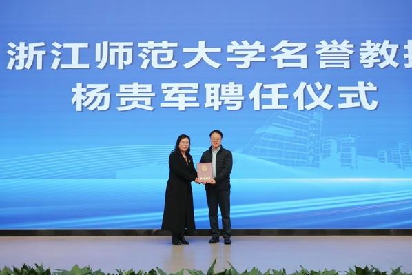 浙师大副校长张建珍向国家农业信息中心技术工程中心教授杨贵军颁发浙师大名誉教授聘书。浙师大融媒体中心 章克锐 摄