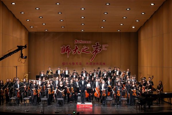 “这场新年音乐会,犹如一部由全校师生共同谱写的艺术交响。”浙师大交响乐团(金华市交响乐团)团长兼常任指挥陶纪泉回忆道,从九月起,60余位师生便开始了密集排练。每周三晚七点至九点是雷打不动的集中排练时间,从每周数次到临近演出时的每日锤炼,排练厅的灯火常亮至深夜。“整场演出结构宏大,上半场与下半场主要为纯器乐演奏,之后则是交响乐与声乐的融合呈现。”他介绍,“为呼应‘相约七秩芳华、共谱浙师风雅’主题,我们在曲目编排中融入了金华本土文化元素,秉持‘校地共建’理念,力求实现兼具本土性与精致感的艺术表达。”