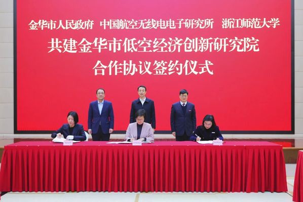 1月9日,金华市人民政府、中国航空无线电电子研究所(简称上电所)、浙师大共建金华市低空经济创新研究院合作协议签约仪式举行。金华市委副书记、市长张健,上电所所长王志松、浙师大党委书记蒋云良分别致辞。金华市副市长黄慧,上电所副所长丁晗、浙师大副校长张建珍参加。