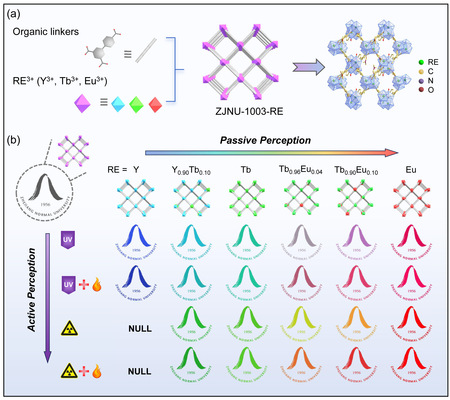 本文构建了具备主动与被动感知能力的稀土-金属有机框架材料ZJNU-1003-RE。该材料表现出优异的闪烁性能,包括高相对光产额(最高约4.22万光子/MeV)、低剂量率检测限及良好的辐照稳定性。一方面,通过人为调控稀土离子的种类与含量,材料实现了宽带可调谐发光,显示出被动感知能力。另一方面,由于光致发光与辐射发光机制不同,材料在紫外光与X射线照射下呈现显著的发光差异。同时,热刺激可影响有机与无机单元间的能量转移过程,使材料表现出热致发光变化特性。因此,该材料能够对辐照与热刺激均实现主动感知。这类多刺激响应的感知材料在原位X射线成像及高安全性光子条形码等领域展现出重要应用潜力。