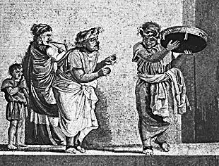 在庞贝的最后百年里,哑剧与拟剧变得十分风靡,两者早在公元前五世纪就已出现于希腊,到了罗马帝国时期,人们无不醉心于此。哑剧大都取自经典的希腊悲剧,是一种由舞蹈和手势组成的无声表演,基本上均为独舞,演员需要独自一人承担剧中所有的角色,随着剧情的发展不断更换面具。剧团内的歌队和乐队成员则配合演员的动作,演唱剧本歌词。在一些残存的涂鸦刻文中,我们可以发现庞贝人对哑剧演员的追崇,如一位名为“阿克提乌斯·阿尼克图斯”的演员显然已经有了不少拥趸,涂鸦可见“舞台巨星阿克提乌斯”“阿克提乌斯,人们的宝贝,快回来”的字样。