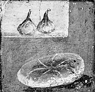 庞贝壁画中被切分成小块的圆形面包和两个无花果 资料图片
